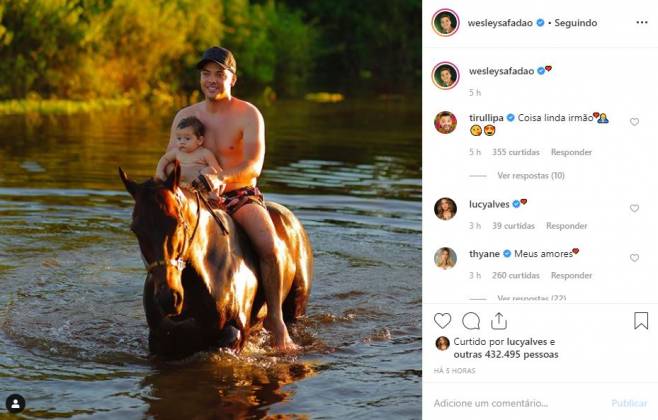 No click postado no Instagram, o sertanejo estava com o pequeno dando um passeio de cavalo por um rio, em meio a natureza.