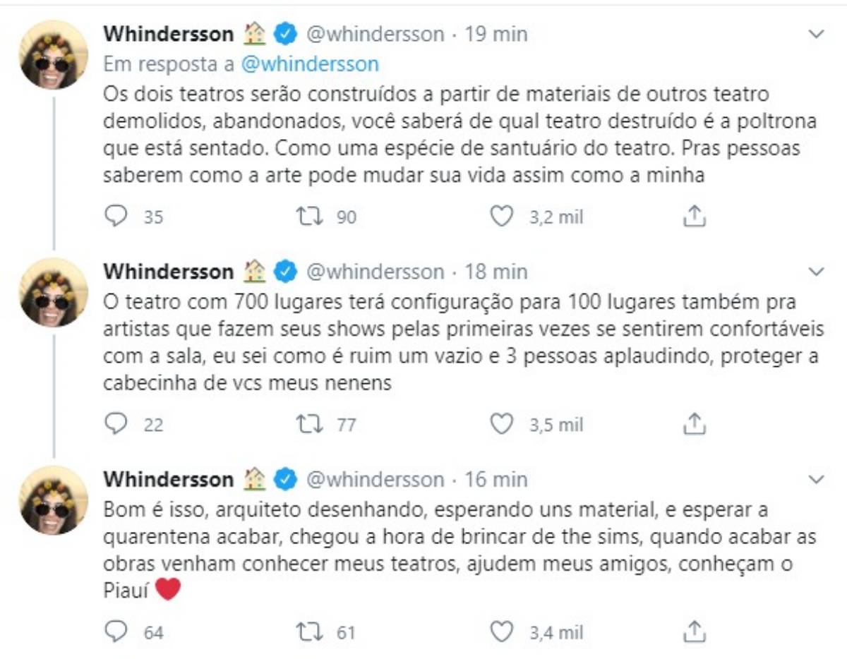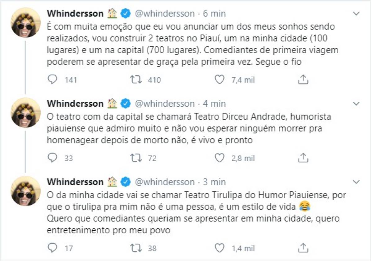 Whindersson falou sobre os nomes que os teatros receberão. “O teatro da capital se chamará Teatro Dirceu Andrade, humorista piauiense que admiro muito e não vou esperar ninguém morrer pra homenagear depois de morto não, é vivo e pronto”, brincou ele.