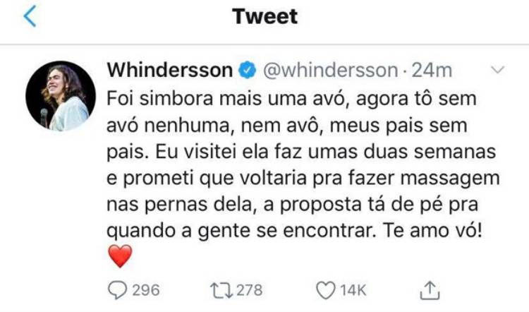 O youtuber Whindersson Nunes usou o seu twitter nesta segunda -feira (10) para dar uma triste notícia a seus seguidores. Ele lamentou a morte de sua avó.