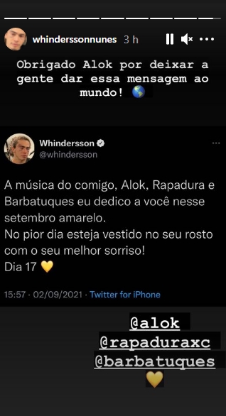 “A música com o Alok, ‘Rapadura e Barbatuques’, eu dedico a você nesse setembro amarelo. No pior dia esteja vestido no seu rosto com o seu melhor sorriso!”, disse ele.