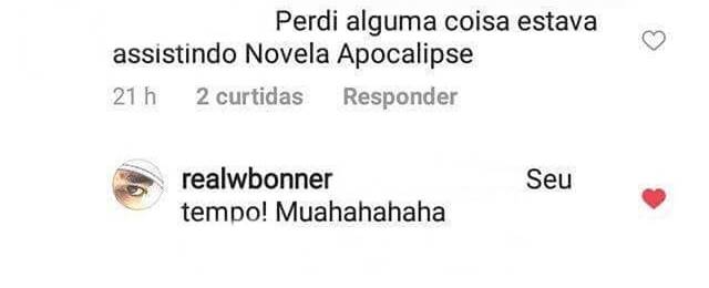Nos comentários, uma internauta que disse se havia perdido alguma coisa, pois estava acompanhando a nova novela da Record, ‘Apocalipse‘, exibida no mesmo horário do “Jornal Nacional”. Bonner não perdeu o bom humor e brincou com a seguidora.