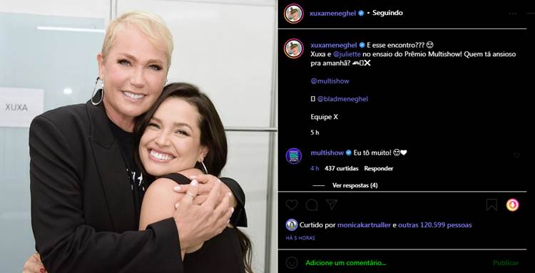 Xuxa publicou em suas redes um clique onde elas aparecem grudadinhas, com um grande sorriso no rosto. Na legenda, ela escreveu: “E esse encontro? Xuxa e Juliette no ensaio do Prêmio Multishow! Quem tá ansioso pra amanhã?”, disse a Rainha dos Baixinhos.