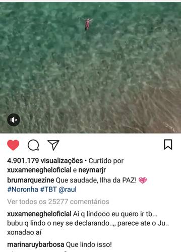 Quem também comentou no vídeo de Bruna foi Xuxa Meneghel, que fez um elogio ao craque: “Ai, que lindo! Eu quero ir também! Bubu, que lindo o Ney se declarando. Parece até o Ju (Junno Andrade). xonadão aí“, escreveu a apresentadora.
