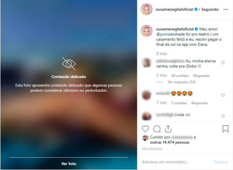 Os fãs da apresentadora acharam estranho a foto ser classificada como delicada, e antes de verem o conteúdo, chegaram a pensar que poderia ser algo mais tenso. “Esquisito! Pra mim essa foto não abriu de primeira, pq o Instagram classificou ela como “conteúdo delicado” um negócio assim! Fui abrir até a foto com medo achando que era algo tenso de se ver! aí era ela maravilhosa tomando sol, sem marquinha”, disse uma internauta. “Também achei estranho aparecer ‘conteúdo sensível'”, afirmou outra seguidora. “Sua foto está como conteúdo pesado. Chocada com o insta”, comentou mais uma, espantada.