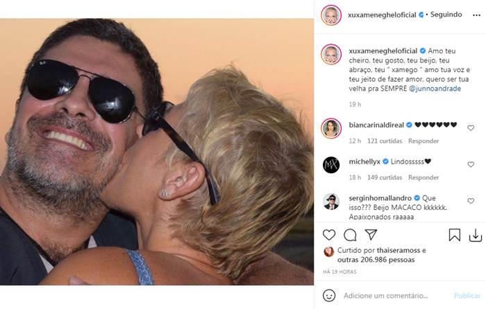 Em seu perfil no Instagram, Xuxa publicou uma foto de um momento íntimo com o cantor e se declarou. “Amo teu cheiro, teu gosto, teu beijo, teu abraço, teu “ xamego “ amo tua voz e teu jeito de fazer amor, quero ser tua velha pra SEMPRE @junnoandrade”, escreveu na legenda.