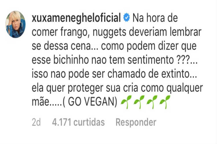 Tudo começou depois que a apresentadora do Dancing Brasil fez um comentário que dizia: “Na hora de comer frango, nuggets deveriam lembrar dessa cena… como podem dizer que esse bichinho não tem sentimento???… isso não pode ser chamado de instinto… ela quer proteger sua cria como qualquer mãe… (GO VEGAN).”