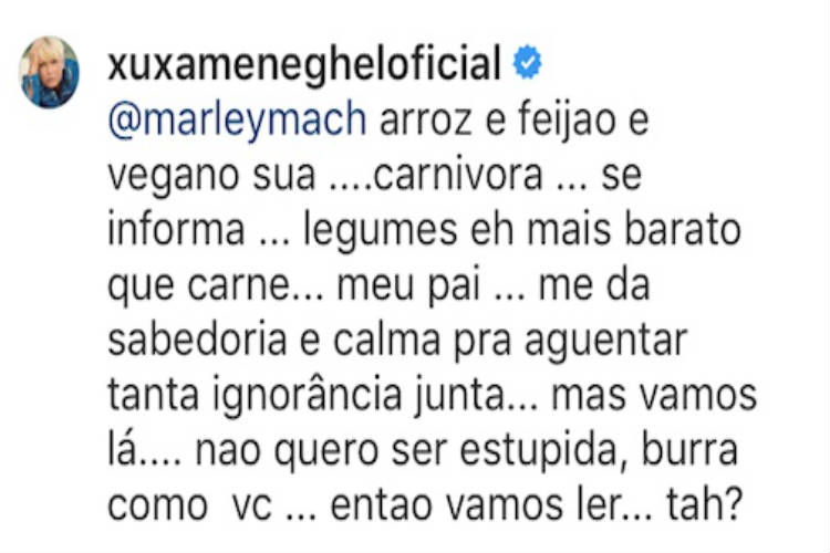 Rebatendo então o comentário, Xuxa resolveu deixar a elegância de lado e disparou: “Arroz e feijão é vegano sua… carnívora…se informa… legumes eh mais barato que carne… meu pai… me dá sabedoria e calma pra aguentar tanta ignorância junta… mas vamos lá… não quero ser estúpida, burra como vc… então vamos ler… tah?”.