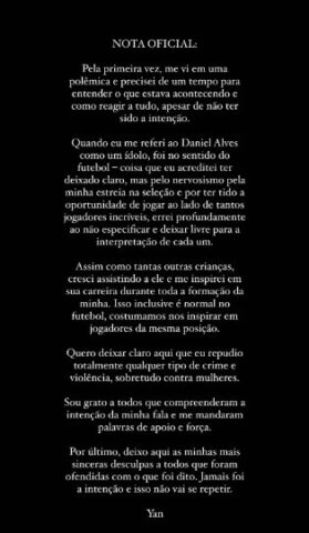 “Pela primeira vez, me vi em uma polêmica e precisei de um tempo para entender o que estava acontecendo e como reagir a tudo, apesar de não ter sido a intenção. Quando eu me referi ao Daniel Alves como um ídolo, foi no sentido do futebol – coisa que eu acreditei ter deixado claro, mas pelo nervosismo pela minha estreia na seleção e por ter tido a oportunidade de jogar ao lado de tantos jogadores incríveis, errei profundamente ao não especificar e deixar livre para a interpretação de cada um“, disse ele, de inicio.