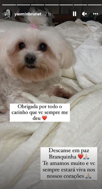 Neste domingo (30) Yasmin Brunet recorreu as redes sociais para lamentar a morte de sua cadelinha de estimação, branquinha.