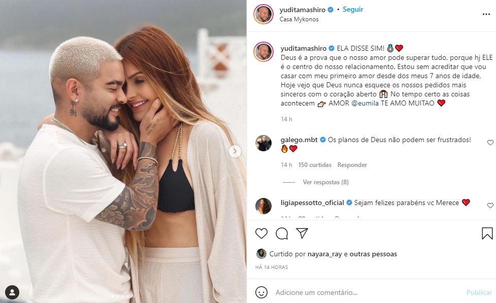 Sendo assim, ele pontuou: “ELA DISSE SIM! Deus é a prova que o nosso amor pode superar tudo, porque hj ELE é o centro do nosso relacionamento. Estou sem acreditar que vou casar com meu primeiro amor desde dos meus 7 anos de idade, Hoje vejo que Deus nunca esquece os nossos pedidos mais sinceros com o coração aberto. No tempo certo as coisas acontecem. AMOR @eumila TE AMO MUITAO”, escreveu.