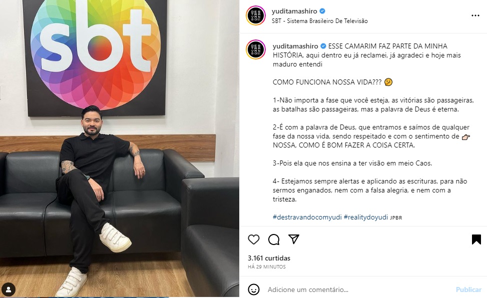 Na publicação, Yudi Tamashiro aparece sentado em seu camarim. Assim, fez algumas confissões: “ESSE CAMARIM FAZ PARTE DA MINHA HISTÓRIA, aqui dentro eu já reclamei, já agradeci e hoje mais maduro entendi”. Sendo assim, deu a entender que o SBT foi mais do que importante em sua vida profissional e, também, pessoal.