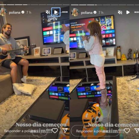 O encontro dos dois ocorreu no apartamento do avô Leonardo, pai de Zé Felipe, no qual o futuro herdeiro do sertanejo apareceu cantando e tocando violão para a filha. Ela pediu para que o patriarca cantasse a canção ‘parabéns para você’. O momento foi compartilhado pela avó, Poliana Rocha, que celebrou a alta médica da netinha: “Nosso dia começou assim”, escreveu a famosa.