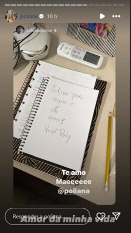 “Estiver por aqui e te amo, vovó Poly“, estava escrito na cartinha fofa. Nos stories, o cantor a reagiu na legenda, escrevendo que amava sua mãe. “Te amo mãeeeee @poliana“, declarou ele. “Amor da minha vida“, respondeu ela, já em seus stories.