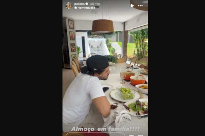 Na casa dos pais em Goiânia, ao lado de um amigo, ele apareceu durante o almoço, sendo a primeira foto do cantor após 19 horas do seu comunicado envolvendo o término com a boiadeira. “Almoço em família”, legendou Poliana.