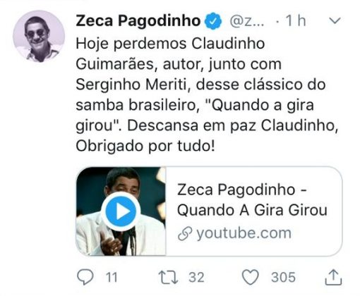 Zeca Pagodinho usou as redes sociais para lamentar a morte do sambista. Pagodinho fez grande sucesso com a música ‘Quando a Gira Girou’, de autoria de Claudinho Guimarães. “Hoje perdemos Claudinho Guimarães, autor, junto Serginho Meriti, desse clássico do samba brasileiro, “Quando a gira girou”. Descansa em paz Claudinho. Obrigado por tudo!”, escreveu Zeca Pagodinho no Twitter.