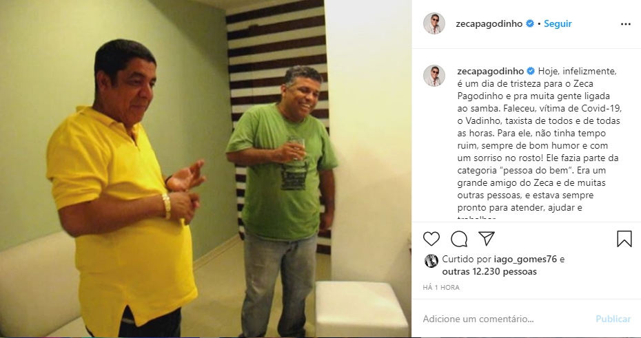 “Hoje, infelizmente, é um dia de tristeza para o Zeca Pagodinho e pra muita gente ligada ao samba. Faleceu, vítima de Covid-19, o Vadinho, taxista de todos e de todas as horas”.