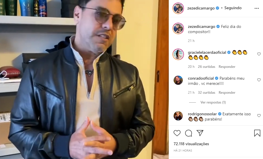 Através do Instagram, o cantor parabenizou a todos os compositores ao prestar uma linda homenagem. Para quem não sabe, Zezé Di Camargo também é compositor de grandes sucessos, um dos maiores de sua carreira é a música ‘É o amor’, sucesso nacional, foi a canção que abriu espaço para que a dupla Zezé Di Camargo e Luciano entrasse de vez no mercado musical.