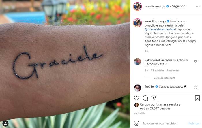 Em seu perfil no Instagram, o cantor mostrou que fez uma tatuagem com o nome da amada no braço. “Já estava no coração e agora está na pele. @gracielelacerdaoficial depois de algum tempo retribuir um carinho, é maravilhoso!!! Obrigado por esses anos todos, me carregar no seu corpo. Agora é minha vez!!”, escreveu na legenda.