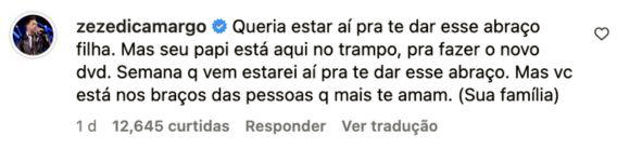 “Queria estar aí para te dar esse abraço filha. Mas seu papi está aqui no trampo, para fazer o novo DVD. Semana que vem estarei aí para te dar esse abraço. Mas você está nos braços das pessoas que mais te amam. (Sua família)“, disse Zezé.