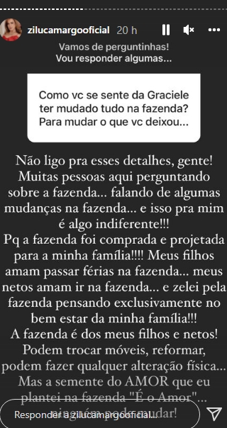 Zilu que foi casada com o cantor por mais de 30 anos, fez questão de frisar que aquele lugar é de sua família: “A fazenda é dos meus filhos e netos! Podem trocar móveis, reformar, podem fazer qualquer alteração física, mas a semente do amor que eu plantei na fazenda É O Amor, ninguém pode mudar”.