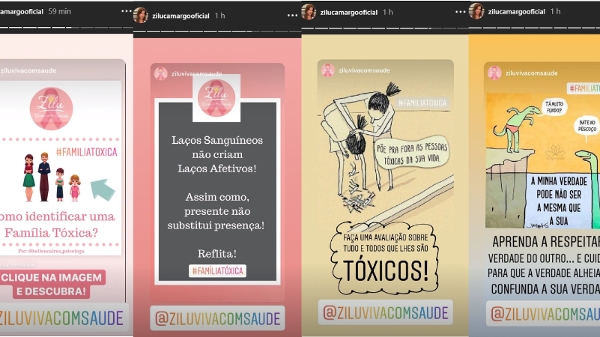 Na ferramenta Stories, inclusive, o perfil foi mais a fundo ao usar ilustrações com outras mensagens. “Laços sanguíneos não criam laços afetivos! Assim como presente não substitui presença! Reflita!”, dizia uma das imagens. “Faça uma avaliação sobre tudo e todos que lhes são tóxicos!”, escreveu ela em outra foto. “Aprenda a respeitar a verdade do outro… e cuidado para que a verdade alheia não confunda a sua verdade!”, completou. Já em seu perfil particular, inclusive, onde soma pouco mais de 600 mil seguidores, Zilu repostou todo o conteúdo, dando a entender de que poderia estar, de fato, convivendo com uma destas situações.