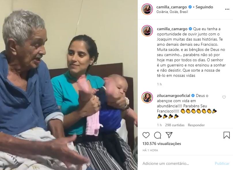 Na legenda do vídeo a filha de Zilu e Zezé celebrou a saúde de seu Francisco e desejou mais oportunidades de ficar lado a lado com o avô e ouvir suas boas histórias. “Que eu tenha a oportunidade de ouvir junto com o Joaquim muitas das suas histórias. Te amo demais demais seu Francisco”, disse ela.