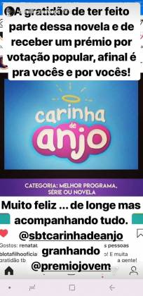 A atriz participou da novela “Carinha de Anjo“, do SBT, e através dos stories, demonstrou felicidade ao saber que a novela ganhou na categoria que concorria.