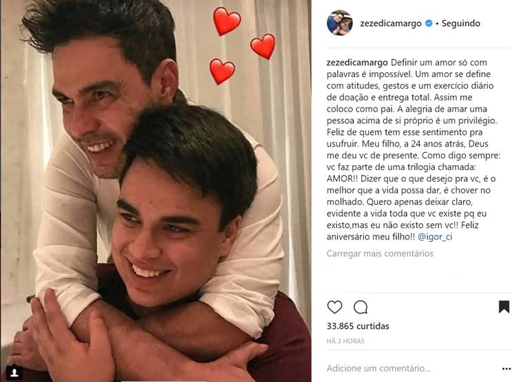 Zezé também postou uma homenagem para o filho: “Definir um amor só com palavras é impossível. Um amor se define com atitudes, gestos e um exercício diário de doação e entrega total. Assim me coloco como pai. A alegria de amar uma pessoa acima de si próprio é um privilégio. Feliz de quem tem esse sentimento pra usufruir. Meu filho, a 24 anos atrás, Deus me deu vc de presente. Como digo sempre: vc faz parte de uma trilogia chamada: AMOR!! Dizer que o que desejo pra vc, é o melhor que a vida possa dar, é chover no molhado. Quero apenas deixar claro, evidente a vida toda que vc existe pq eu existo,mas eu não existo sem vc!! Feliz aniversário meu filho!! @igor_ci”.