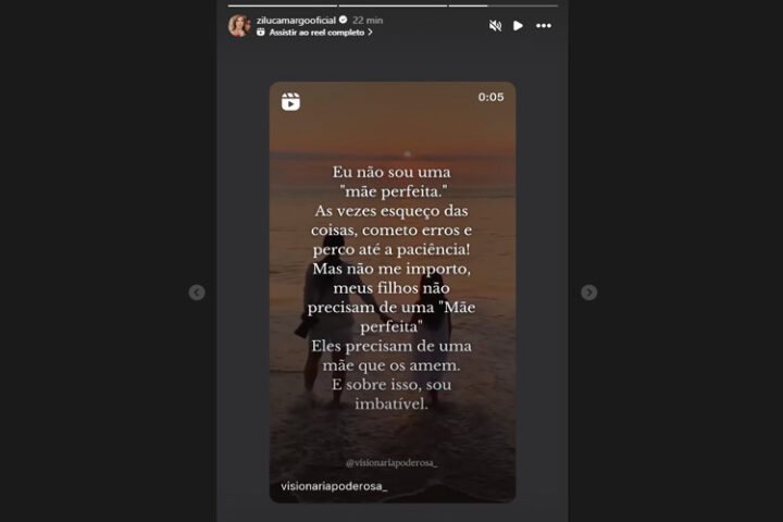 “Eu não sou uma ‘mãe perfeita’. Às vezes esqueço das coisas, cometo erros e perco até a paciência! Mas não me importo, meus filhos não precisam de uma ‘mãe perfeita’. Eles precisam de uma mãe que os ame. E sobre isso, sou imbatível”, diz o texto compartilhado por Zilu.
