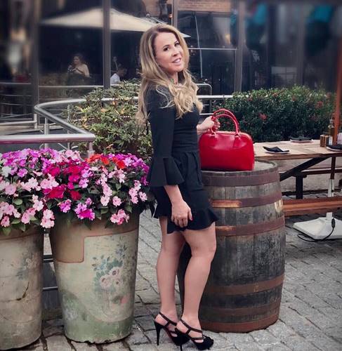 Ela compartilhou uma foto em que aparece toda produzida, com um vestidinho preto, salto alto e bolsa vermelha.