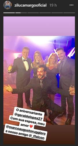“O aniversariante Geraldo Lopes com sua esposa, meu amor, Marco Augusto Ruggiero, e o nosso amigo Falcon”, escreveu ela na imagem. Já em sua rede social, ele que é produtor executivo mostrou um outro click do casal ao lado do aniversariante.