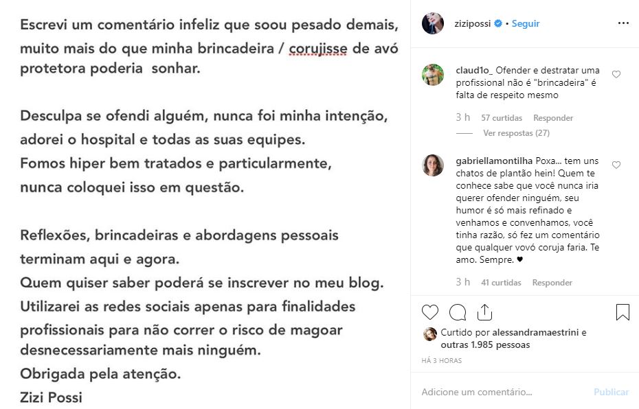 “Escrevi um comentário infeliz que soou pesado demais, muito mais do que minha brincadeira/corujisse de avó protetora poderia sonhar. Desculpa se ofendi alguém, nunca foi minha intenção, adorei o hospital e todas as suas equipes. Fomos hiper bem tratados e particularmente, nunca coloquei isso em questão”, afirmou ela.