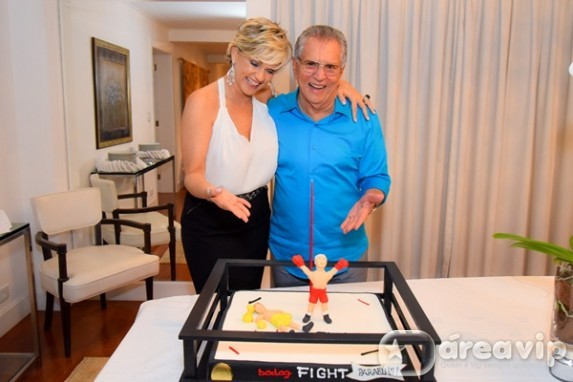 A esposa Andréa presenteou o marido com um bolo, feito pela Isabela Suplicy, para homenagear o programa e o humorista sobre a vitória da Praça é Nossa em cima do Programa do Gugu, nesta quinta feira (12).