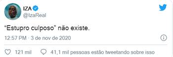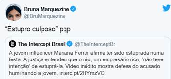 Bruna Marquezine compartilhou um reportagem do Intercept Brasil no Twitter e também fez o seu protesto. “Estupro culposo – pqp”, escreveu a atriz. “Estupro culposo é tipo o lado sombrio da lenda do boto na Amazônia, ambos criados por homens pra defender estuprador e culpabilizar as vítimas. ÉGUA BRASIL”, publicou a cantora Gaby Amarantos no microblog. “ “‘Estupro culposo’ não existe”, sentenciou Iza.