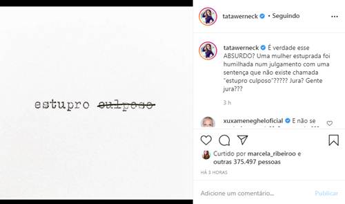 Nas redes sociais, logo famosas se manifestaram contra a decisão. “É verdade esse ABSURDO? Uma mulher estuprada foi humilhada num julgamento com uma sentença que não existe chamada “estupro culposo”????? Jura? Gente jura???”, escreveu Tatá Werneck em seu perfil no Instagram.