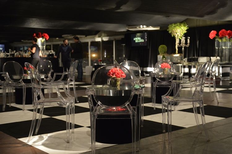 Os convidados da festa de lançamento de ‘A Regra do Jogo’, próxima novela das nove, foram recepcionados por um corredor em que as paredes estavam todas forradas de preto e o piso representava um imenso tabuleiro de xadrez em preto e branco, com suas respectivas peças espalhadas pelo chão. No salão principal, sofisticação e elegância na decoração. As mesas do bufê tinham espelhos bisotados, e dois lustres gigantes em cristal foram pendurados no pé-direito duplo do salão. Todo o piso foi forrado de preto e branco, dando continuidade ao jogo da entrada. Buquês de flores vermelhas marcaram o ambiente, quebrando a predominância do preto e branco. No mezanino, espaçosos lounges com sofás e poltronas, decorados de forma semelhante ao salão principal, dava a sensação de estar em um imenso camarote.