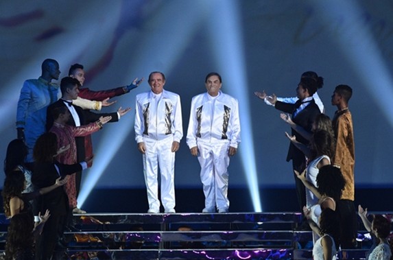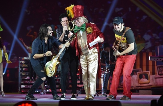 A célebre frase “quem não se comunica se trumbica” voltou a ecoar no Maracanãzinho. E ao som da banda Jota Quest, o velho guerreiro comandou a festa e relembrou os programas de auditório, com direito a bacalhau sendo lançado para o público. Também foi Chacrinha que deu a deixa para mais uma homenagem: o bordão “Roda, roda, roda e a avisa. Um minuto pro comercial” celebrou a parceria entre a Globo e seus anunciantes ao longo das cinco décadas. As inúmeras minisséries e seriados, sucessos de audiência que tanto retrataram a diversa cultura do Brasil, por meio de suas exuberantes paisagens e adaptação de obras-primas literárias, receberam a performance de bailarinos.