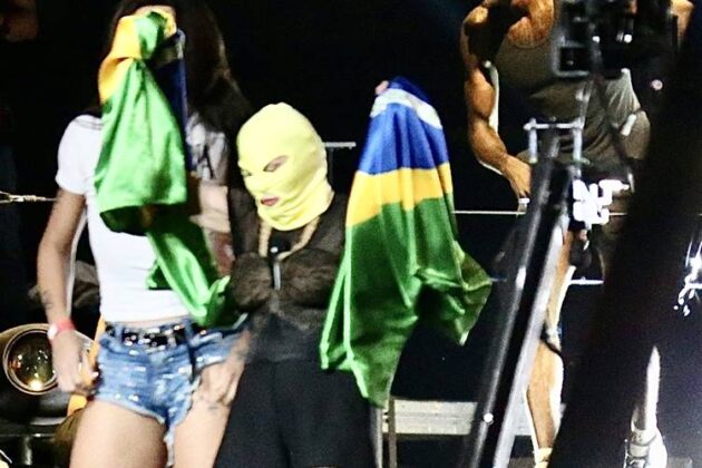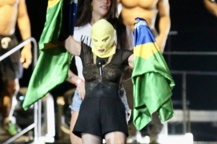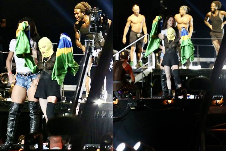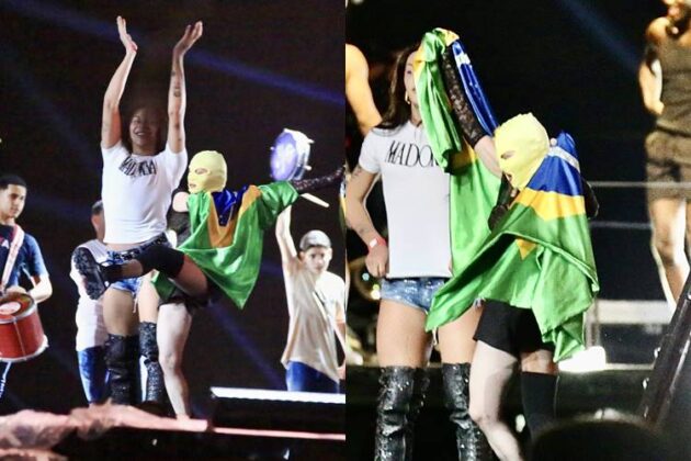 Madonna usava uma roupa preta e máscara verde. Pabllo Vittar ensaiou com a rainha do pop que estava enrolada em uma bandeira do Brasil. Essa é a primeira vez que a cantora apareceu em público desde sua chegada ao Rio de Janeiro na última segunda-feira, 29.
