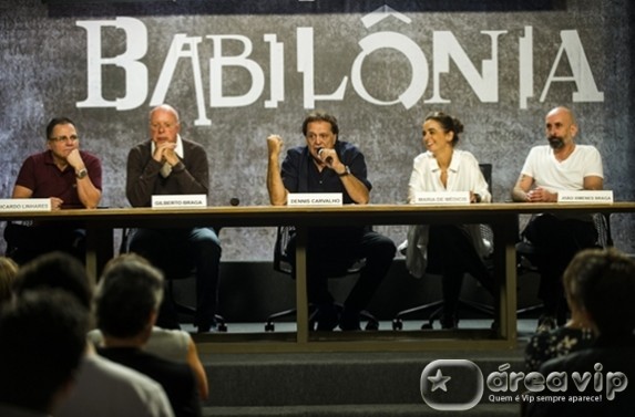 Empolgação e entrosamento são as palavras que podem definir o clima em que aconteceu a apresentação da próxima trama das 21h da Globo, ‘Babilônia’ à imprensa na tarde de quarta-feira, dia 25, no Projac. O cenário do casal Beatriz (Gloria Pires) e Evandro (Cassio Gabus Mendes) compôs o ambiente, que contou com a presença de todo o elenco, do diretor-geral e de núcleo Dennis Carvalho, da diretora-geral Maria de Médicis e dos autores Gilberto Braga, Ricardo Linhares e João Ximenes Braga.