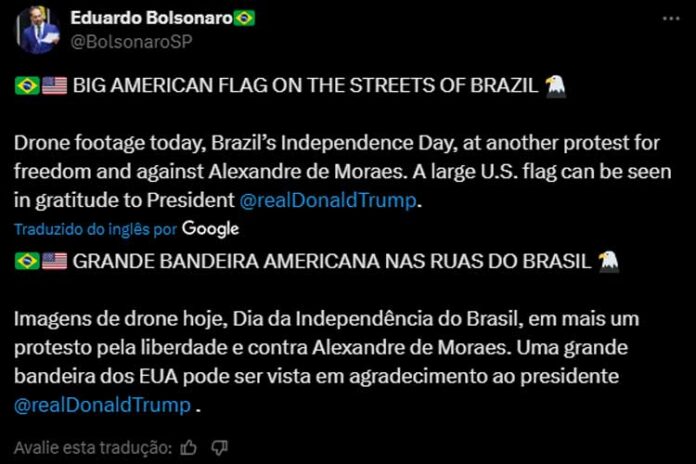 Através de seu perfil no X (antigo Twitter), Eduardo Bolsonaro falou sobre o ato, os descrevendo, em suas palavras, como um agradecimento ao presidente Donald Trump. “Grande bandeira americana nas ruas do Brasil. Imagens de drone hoje, Dia da Independência do Brasil, em mais um protesto pela liberdade e contra Alexandre de Moraes. Uma grande bandeira dos EUA pode ser vista em agradecimento ao presidente Donald Trump”, destacou.