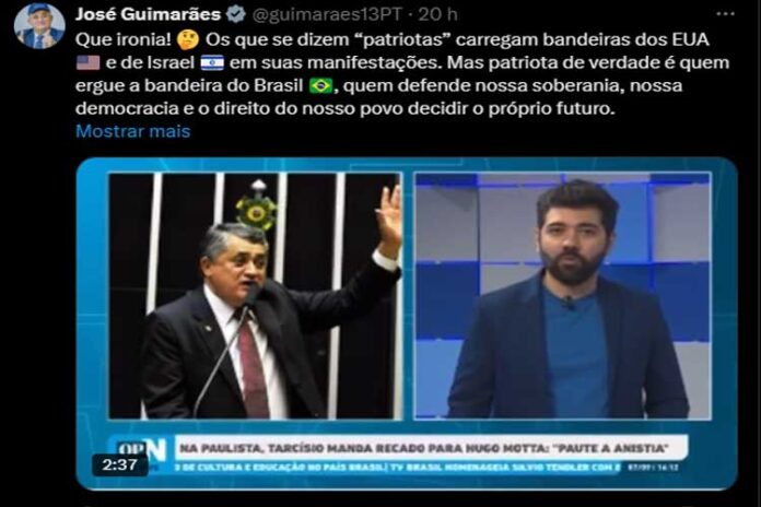 Por outro lado, José Guimarães (PT-CE), líder do governo na câmara, criticou o ato, dizendo que os “verdadeiros patriotas carregam a bandeira do Brasil”. “Que ironia! Os que se dizem “patriotas” carregam bandeiras dos EUA e de Israel em suas manifestações. Mas patriota de verdade é quem ergue a bandeira do Brasil, quem defende nossa soberania, nossa democracia e o direito do nosso povo decidir o próprio futuro”, comentou.