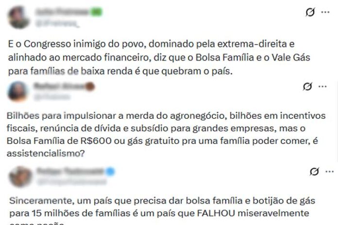 Várias pessoas consideraram injusto políticos criticarem programas do governo enquanto recebem reajustes e benefícios que causam um grande impacto para o orçamento. “Bilhões para impulsionar o agronegócio, bilhões em incentivos fiscais, renúncia de dívida e subsídio para grandes empresas, mas o Bolsa Família de R$600 ou gás gratuito pra uma família poder comer, é assistencialismo?”, questionou um internauta.