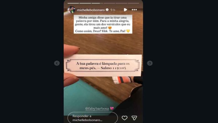 Michelle Bolsonaro foi pega de surpresa após amiga tirar um versículo bíblico que, segundo a esposa de Bolsonaro, é um dos seus favoritos. Ela compartilhou a mensagem em seu Story no Instagram, agradecendo a Deus pela proteção.