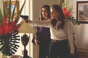 Ao entrar no quarto, Nanda tem uma surpresa. Yvone está ali. A golpista nem deixa a “amiga” desconfiar de nada e vai logo explicando: “Descolei o endereço dele na livraria e vim… Esse canalha não volta atrás! Diz que não volta!” Yvone tenta convencer Nanda a ir embora, mas ela decide tirar o revólver da bolsa e ameaçar Mike. O golpista tenta acalmar Nanda, mas ela está desesperada: “As gravações todas! Todas aqui. Você falou que tinha outra guardada em outro lugar. Liga pra pessoa, manda trazer aqui. Agora! Mike começa a enrolar Nanda e ela fica cada vez mais inquieta. Yvone entra no circuito e tenta tirar a arma da mão de Nanda. Nesse momento, Mike faz um movimento e Nanda acaba atirando sem querer.