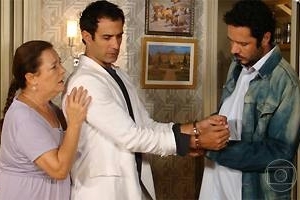 Piedade abraça o filho e Espeto também pula nos braços do pai, que dá um beijo no filho.
