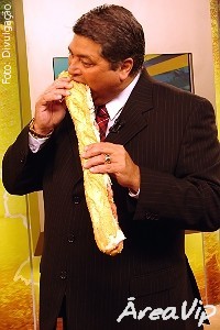 Datena come baguete para simbolizar sua torcida pelo Brasil contra a França na Copa da Alemanha