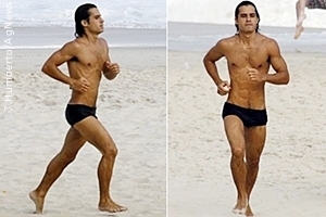 André Arteche, o Indra de ′Caminho das Índias′ foi clicado no domingo (10) na praia. O moreno aproveitou para dar um mergulho e correr na praia de Ipanema, no Rio.