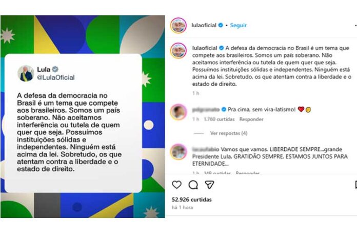 Luiz Inácio Lula da Silva (PT) reagiu após Donald Trump publicar um post em defesa do ex-presidente do Brasil, Jair Messias Bolsonaro. Sem citar o nome do presidente dos EUA, o político afirmou que cabe somente ao Brasil e aos brasileiros decidirem sobre assuntos do seu país.