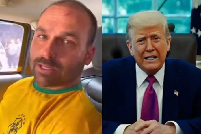 Eduardo Bolsonaro reagiu após a decisão do ministro do STF, Alexandre de Moraes. Foi determinada a utilização de tornozeleira eletrônica pelo ex-presidente. No X (antigo Twitter), Eduardo marcou o perfil de Donald Trump e declarou o seguinte: