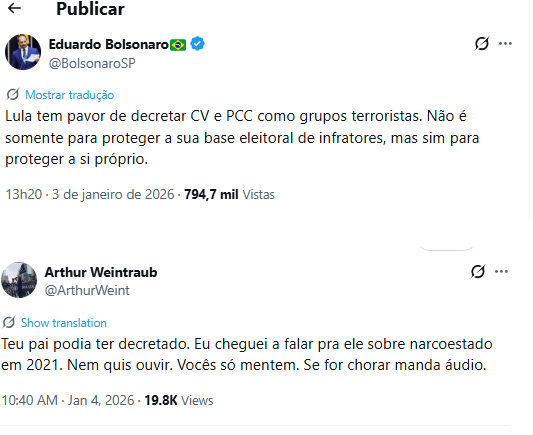 Dessa forma, Weintraub refutou a alegação, direcionando a crítica ao próprio período bolsonarista, dizendo que abordou o mesmo tema com o ex-presidente, mas foi ignorado. Em sua resposta, ele escreveu: “teu pai [Bolsonaro] podia ter decretado [PCC e CV como grupos terroristas]”.